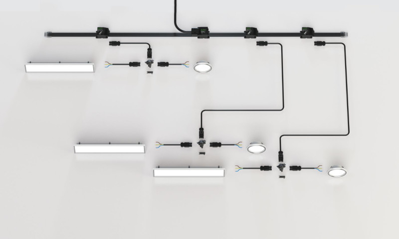 Leuchten werden über steckbare Abgänge angeschlossen und durch die Wahl der Phase fest einer Leuchtengruppe zugeordnet. So lassen sich Beleuchtungszonen zentral schalten, ohne jede Leuchte einzeln zu verdrahten.