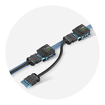 Abbildung: Steckbare Verkabelung für dimmbare Beleuchtung mit Flachleitung und DALI- bzw. 1–10 V-Steuerung.