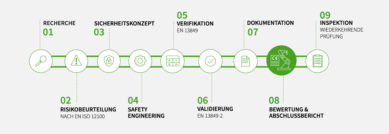 Unsere ausgebildeten, erfahrenen Sicherheitsspezialisten unterstützen Sie bei jedem Schritt zur sicheren Maschine. In Form von Dienstleistungen beraten wir Sie vor Ort , erarbeiten Risikobeurteilung, Sicherheitskonzept und Validierungspläne und erstellen die für die Konformitätserklärung notwendige Dokumentation.