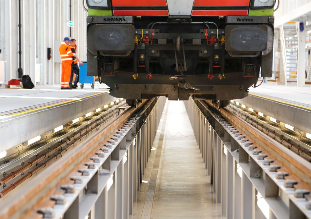 Den Technikern, die unter den Zügen arbeiten, verschaffte man optimale Lichtbedingungen durch ein geschütztes Beleuchtungssystem, das bei Bedarf einfach und schnell verändert werden kann.