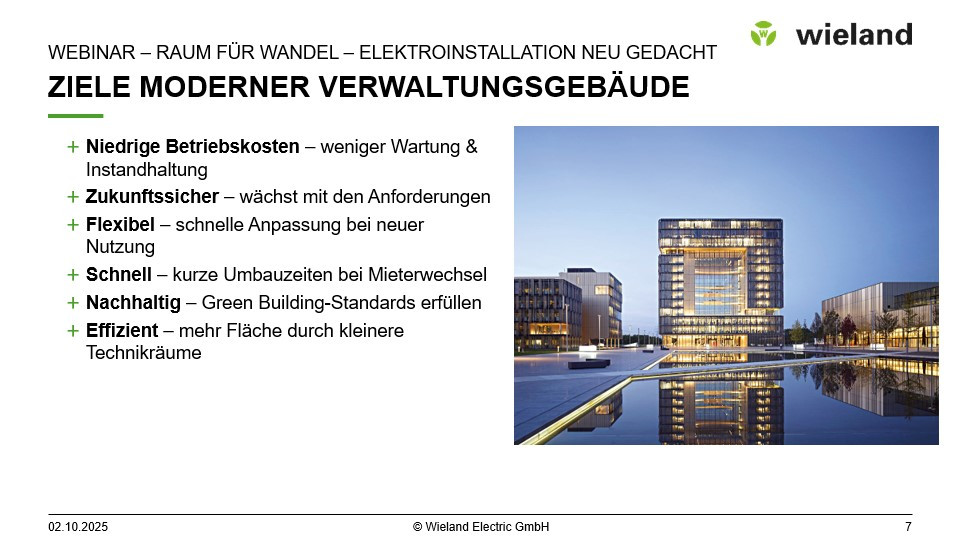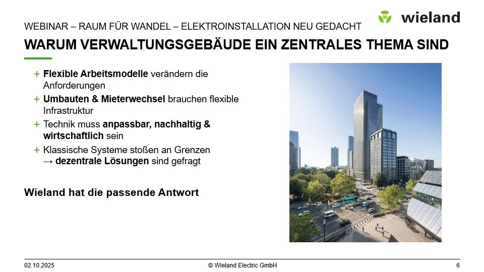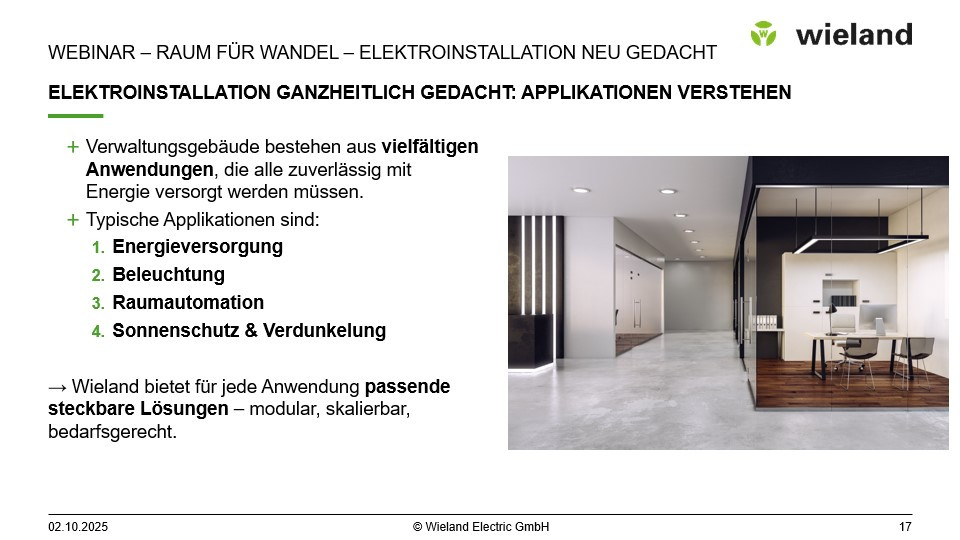 In dieser Webinar-Aufzeichnung erfahren Sie, wie Sie mit Wieland Systemlösungen eine skalierbare, energieeffiziente und steckbare Elektroinstallation realisieren – ideal für dynamische Raumkonzepte und höchste Planungssicherheit.