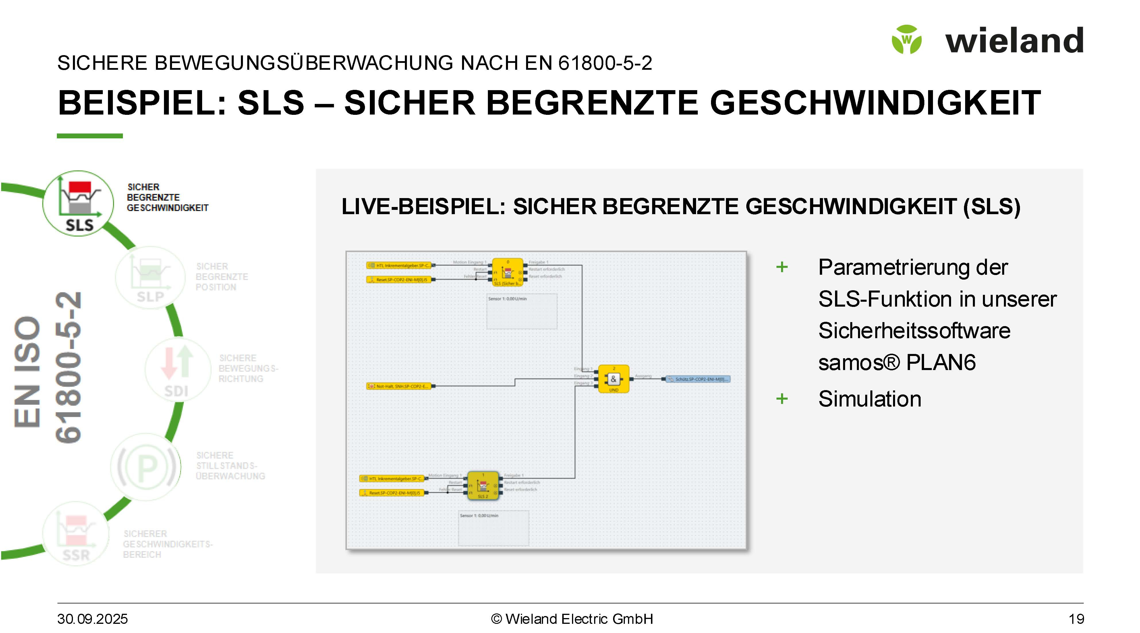 In dieser Aufzeichnung erfahren Sie, wie Sie typische Sicherheitsfunktionen wie SLS (Safe Limited Speed) oder SDI (Safe Direction) gemäß EN 61800-5-2 normgerecht in elektrische Antriebe integrieren. Sie lernen außerdem, wie sich diese Funktionen mit vorkonfigurierten Funktionsbausteinen schnell und effizient umsetzen lassen.