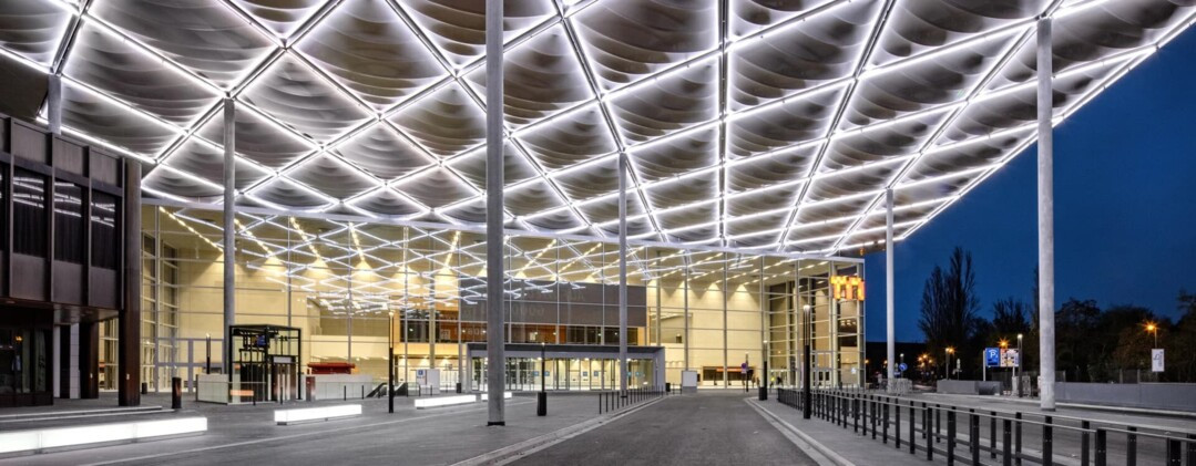 Stretching futuristically over the forecourt of Hall 1, a "floating" roof structure spans the Düsseldorf Trade Fair grounds. Covering an area of 7,800 sqm, the canopy protects fair visitors from the elements and creates a bright, friendly atmosphere thanks to its translucent design. Impressively, the canopy also shines at night with innovative LED lighting. The underlying electrical installation, for which the Bamberg-based technology company Wieland Electric is responsible, plays a crucial role in the longevity of the lighting.